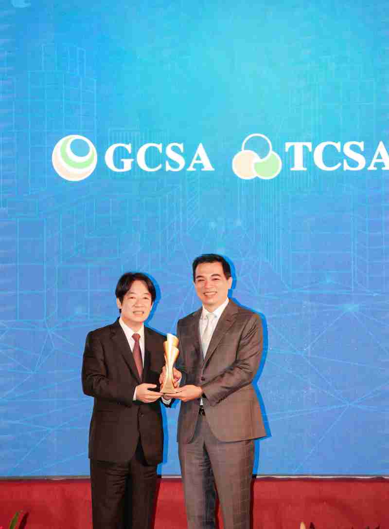 达全方位永续表现获全球永续奖及台湾永续奖肯定,,由副总统赖清德颁奖 (左),,,,CG电子总经理柯富仁 (右) 代表领奖