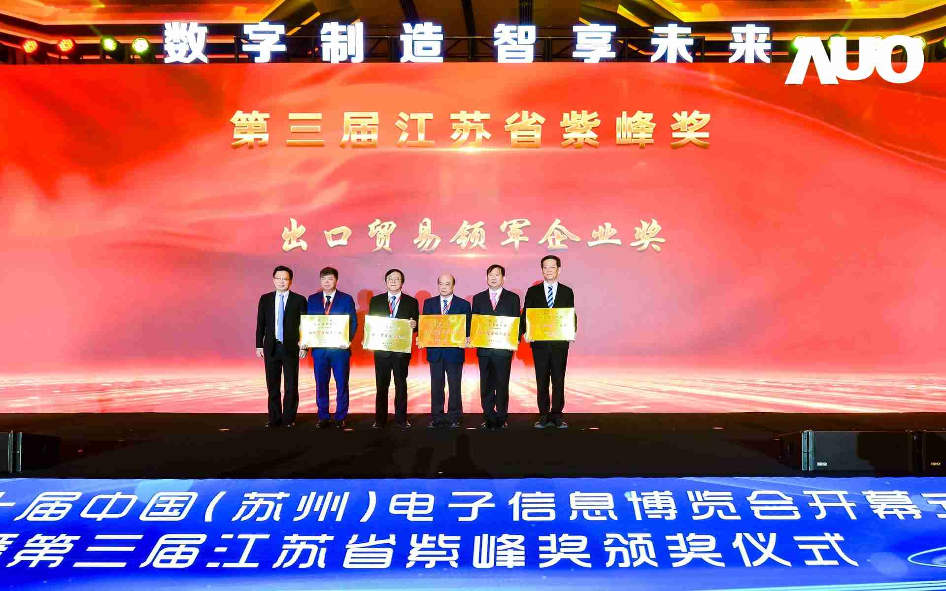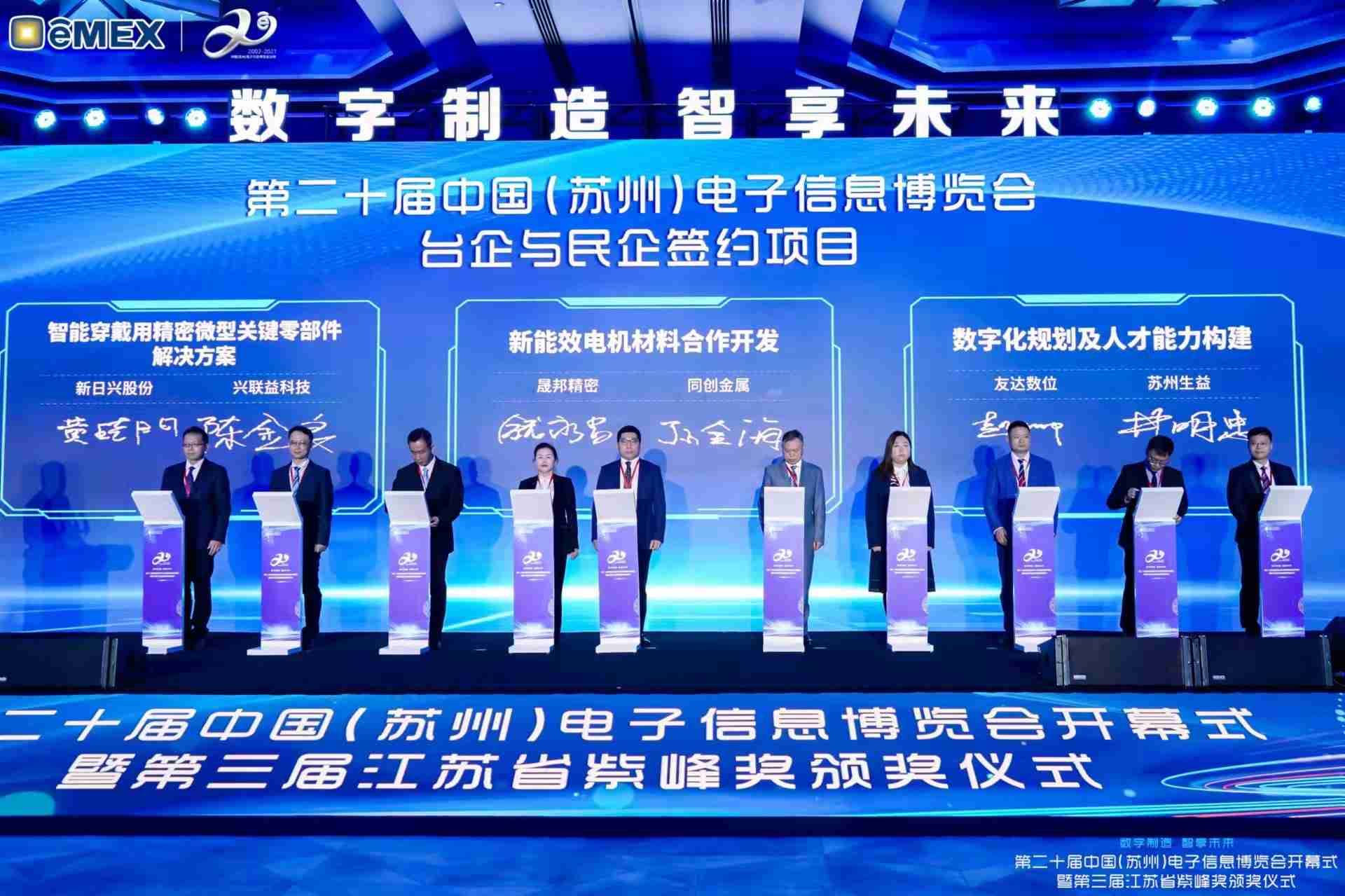 电博会开幕式当天也是第三届江苏省紫峰奖颁奖仪式,,,省台办、、工信厅、、商务厅、、苏州市相关领导均出席并颁奖。。。该奖项为表彰对江苏高质量发展做出积极贡献的在苏企业,,,,由江苏省政府专门设立。。。。CG电子光电 (苏州) 总经理郭振明代表上台领奖,,,,这也是CG电子苏州连续三次蝉联紫峰奖 出口贸易领军企业奖。。CG电子数位总经理赵丽娜女士,,,也参与本次开幕式,,,上台为本地化赋能签署战略合作协议,,,将优质服务资源集合、、下沉到更多细分行业,,为更多地区的制造企业提供数字化转型服务。。