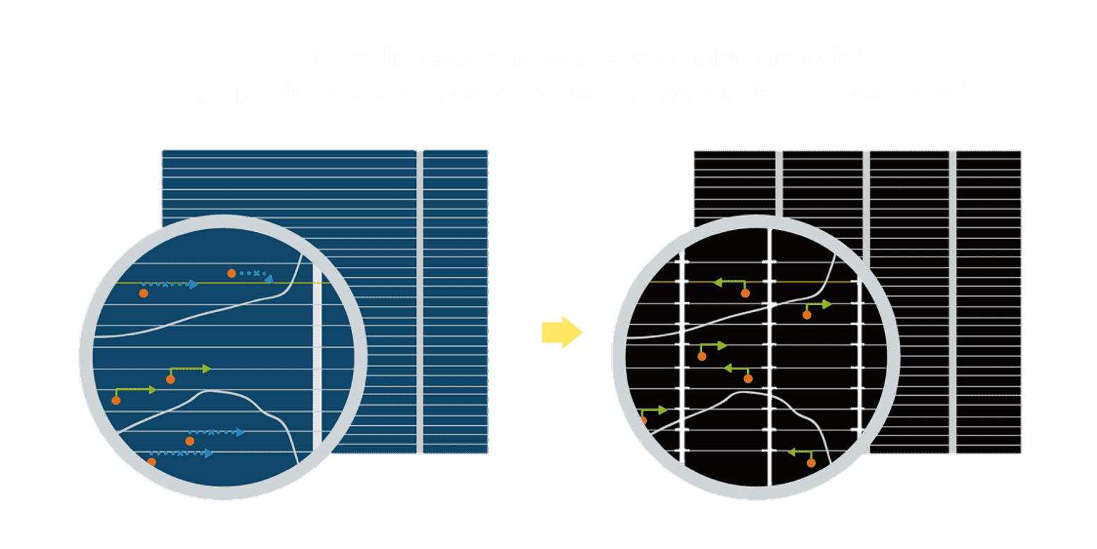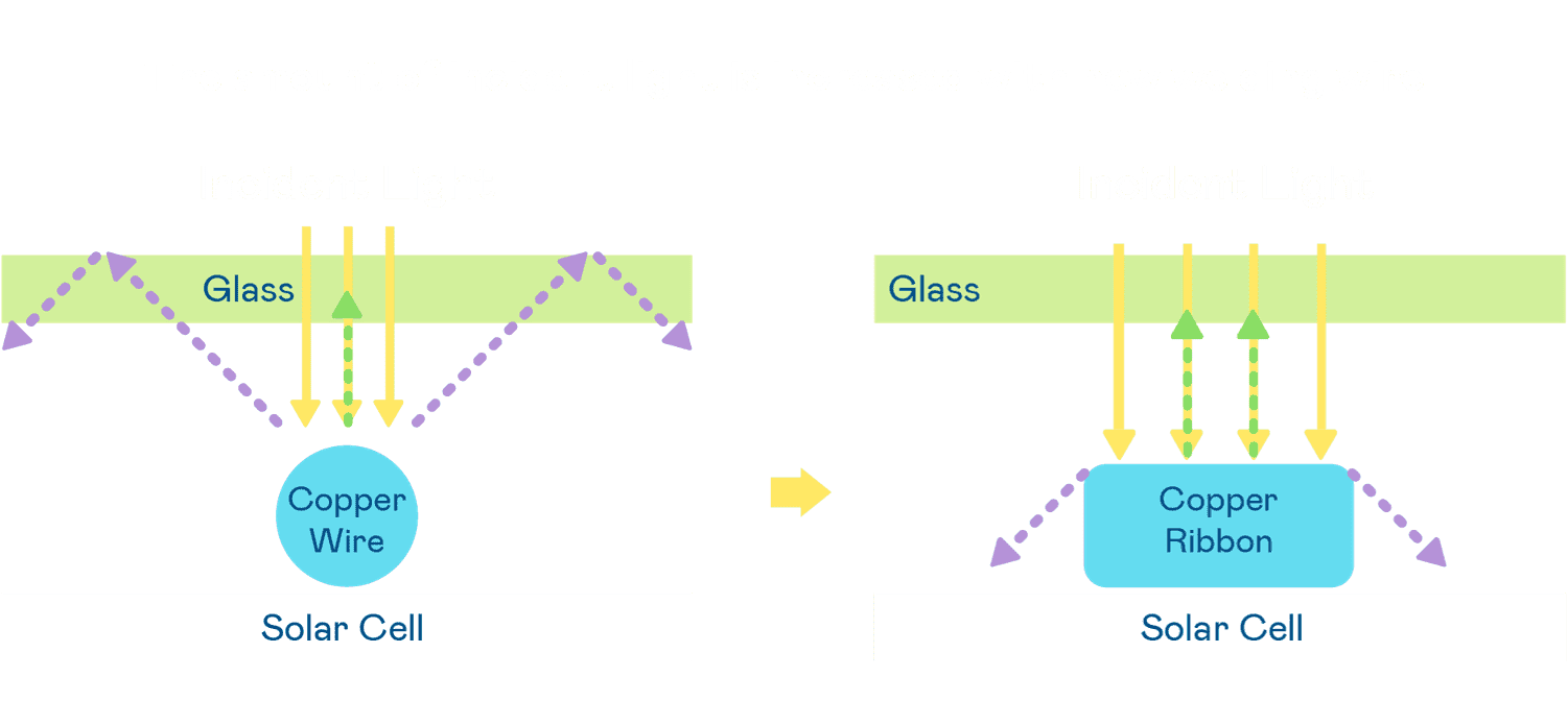• 电池使用多条铜导线 (Copper wire) 于电池片上形成较短的电流路径,,提高电流收集效率,,,,采用圆形设计的铜导线较传统扁平式的铜焊带 (Ribbon),,,可增加入射至电池的光线量。。